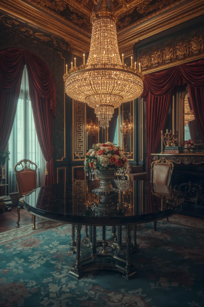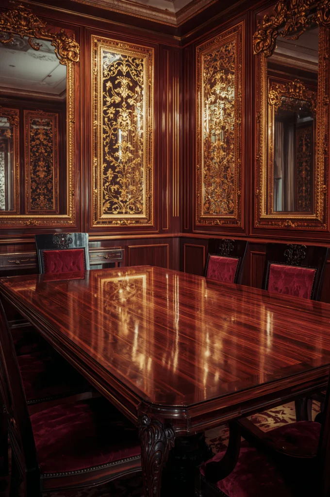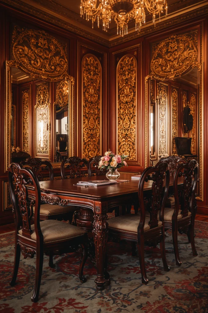 Mahogany or ebony furniture grounds the design with rich, warm undertones.