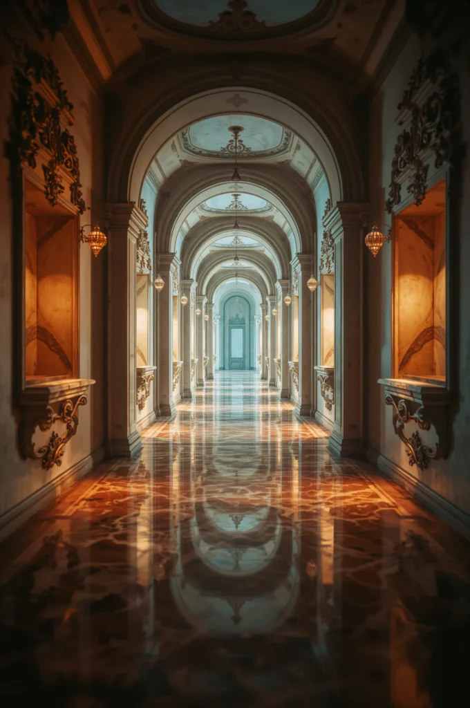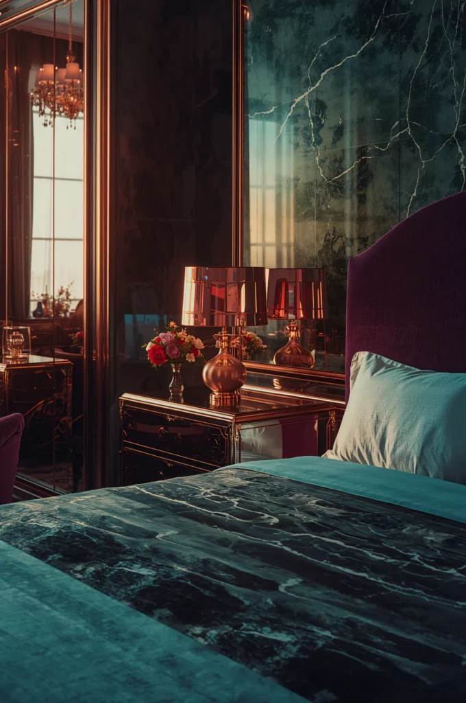 Balance polished marble, lacquered wood, and mirrored surfaces with matte fabrics and soft upholstery for depth.