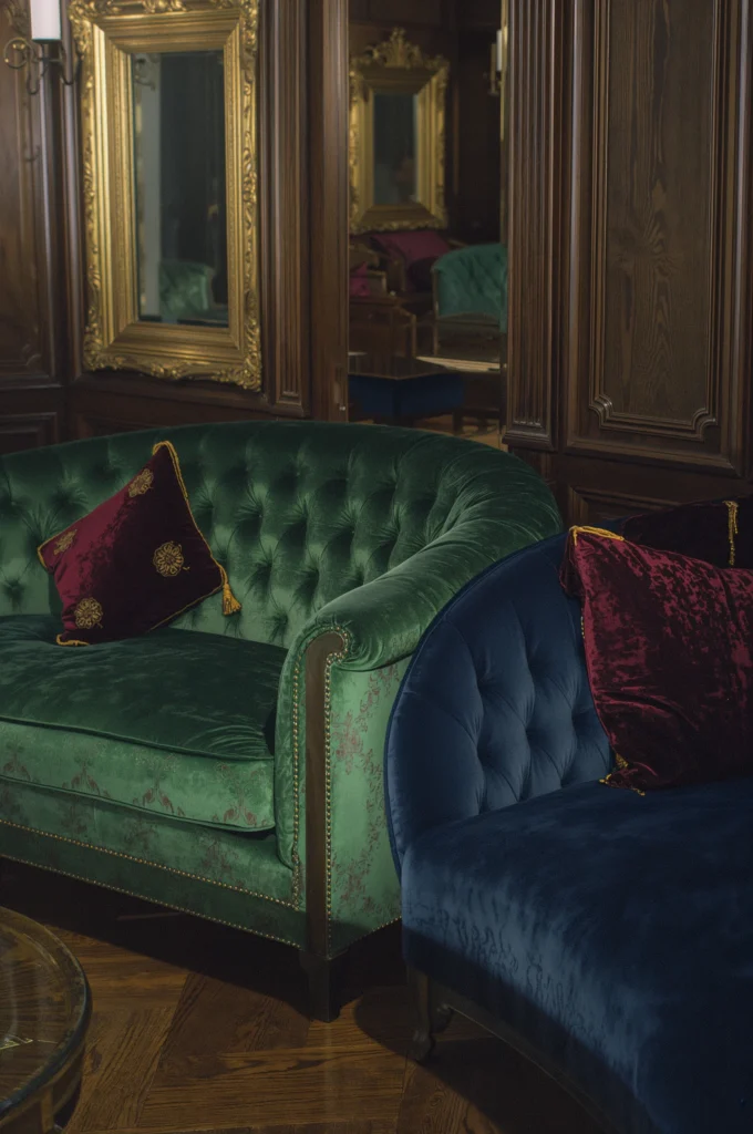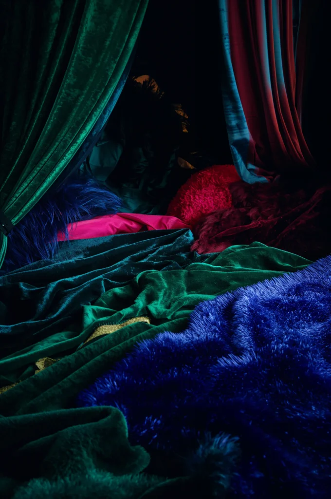 Velvet, satin, silk, and faux fur add tactile richness that enhances the decadent feel.