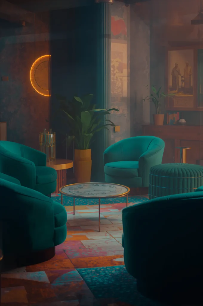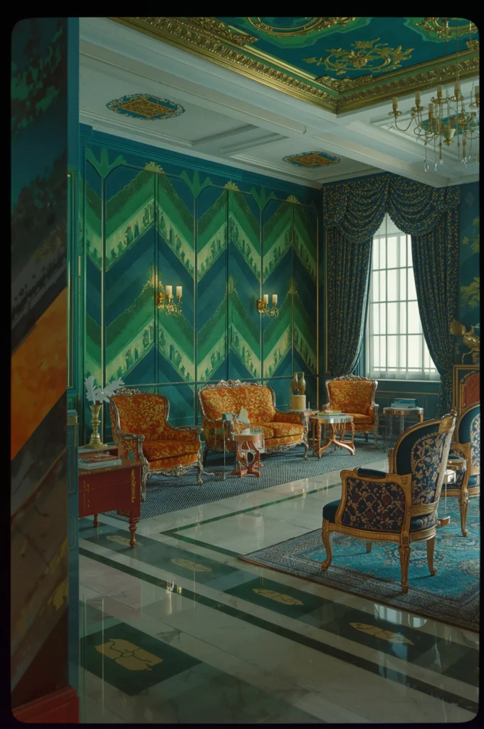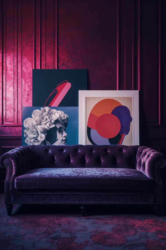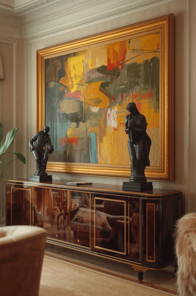 Bold sculptures, gold-framed paintings, or abstract prints enhance the theme.