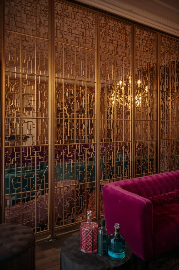 Stylish partitions with geometric or metalwork details create a sense of luxury.