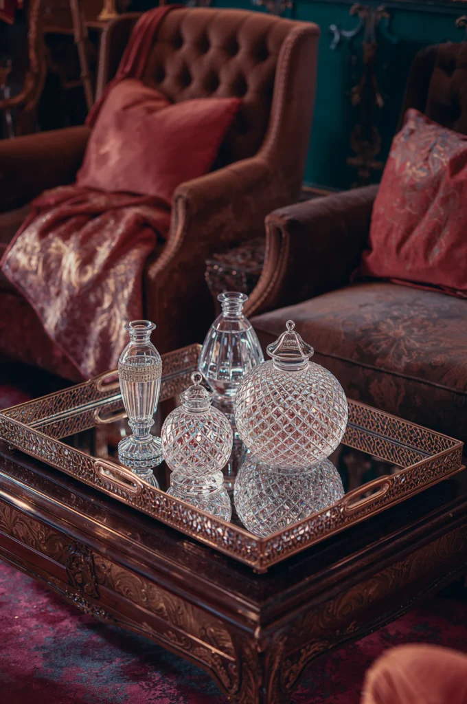 Use crystal vases, lush throws, and polished trays as finishing touches.