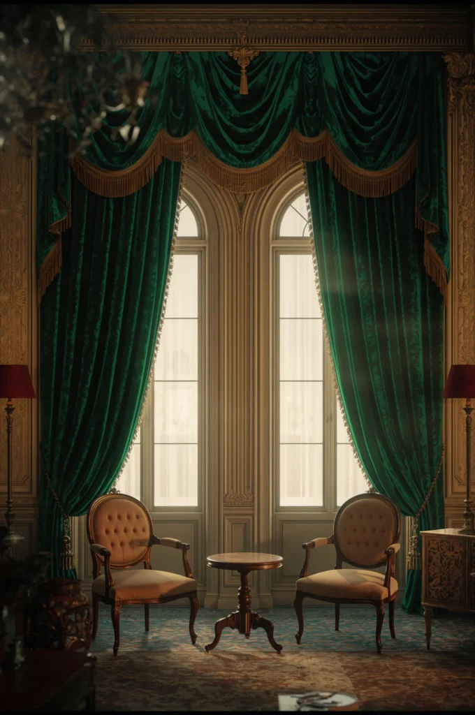 Heavy, rich fabrics in jewel tones with metallic tiebacks frame windows luxuriously.