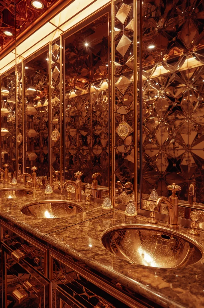 Crystal chandeliers, brass sconces, and geometric pendant lights create focal points that define the Art Deco look.