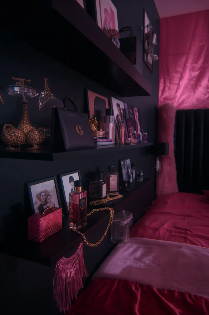 Floating shelves are perfect for showing off perfume collections, handbags, books, or plants. Use sleek acrylic or matte black shelves for a modern look. Style them with chic décor pieces like candles, framed photos, or designer boxes. Floating shelves keep your room organized while also doubling as Instagram-worthy backdrops.