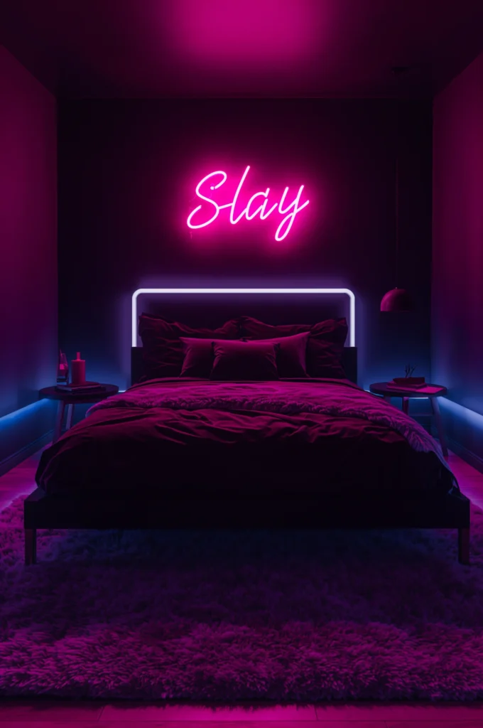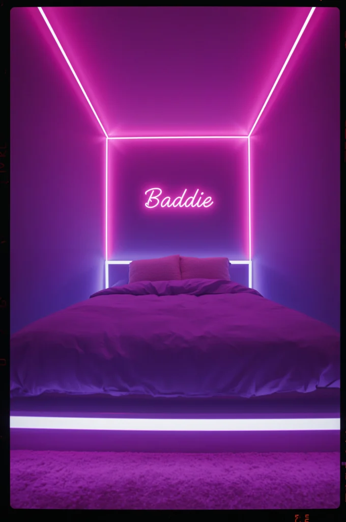 Nothing says baddie bedroom like a glowing neon sign. These fun accents double as wall décor and mood lighting. Choose empowering words like “Boss Babe,” “Slay,” or your own name in bold script. Place it above your headboard, near your vanity, or as a backdrop for selfies. Neon signs create a soft, colorful glow that sets a playful and confident vibe. If you prefer versatility, go with LED strip lights that can change colors with a remote or app. This idea adds character and personality while also enhancing the room’s overall ambiance.
