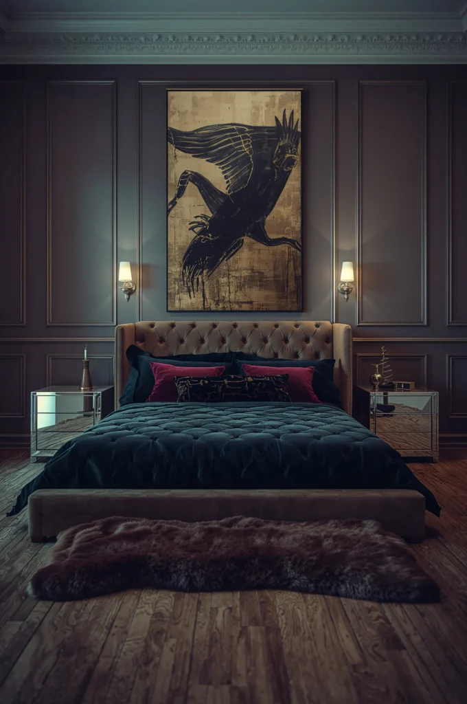 Invest in a large piece of bold wall art, such as an abstract painting or oversized portrait. It creates a strong focal point and makes the room feel curated. Black-and-gold or jewel-tone pieces fit perfectly in a baddie bedroom. One striking piece can elevate the entire vibe.