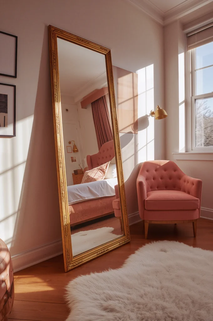 An oversized mirror is both stylish and functional in a baddie bedroom. Floor-to-ceiling or wide gold-framed mirrors not only make your space look bigger but also provide the perfect backdrop for outfit photos. Place your mirror opposite a window to maximize natural light or in a corner to create dimension. Lean it casually against the wall for a relaxed vibe, or mount it for a polished look. A mirror enhances both style and practicality, aligning perfectly with the confident baddie aesthetic.