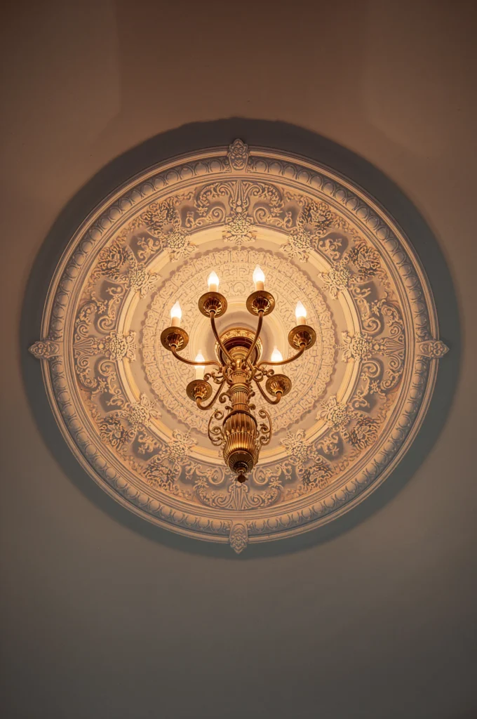 Add ceiling medallions around chandeliers or pendant mounts for vintage flair.