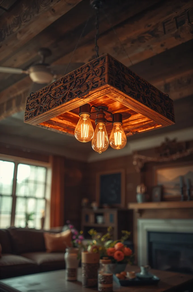 Craft a ceiling light frame using stained wood for a warm, rustic feel.