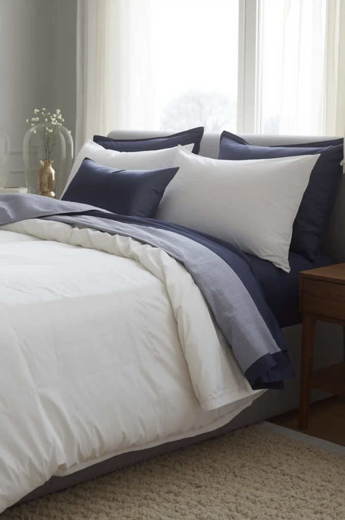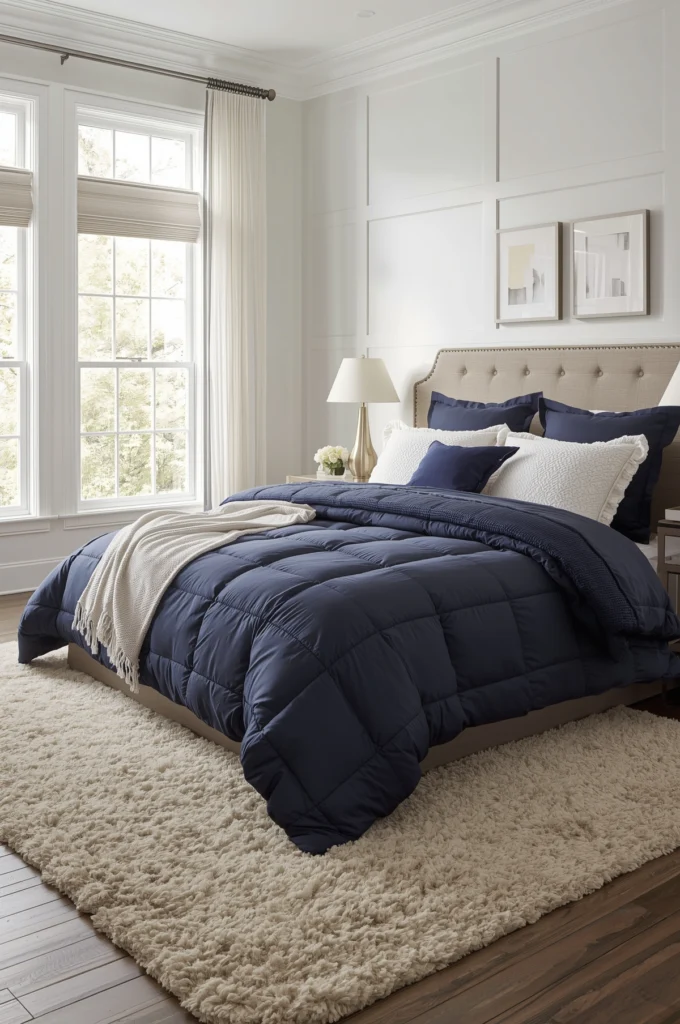 For a crisp, classic look, mix navy and white in your bedding. Use navy sheets with a white duvet cover or vice versa. Add striped or patterned pillows to tie the colors together. This combination works beautifully for a clean, hotel-inspired aesthetic. To keep it from feeling too stark, layer with textured throws or patterned quilts. Navy and white is versatile—it works in coastal, modern, or traditional bedrooms. The pairing is timeless and won’t go out of style.