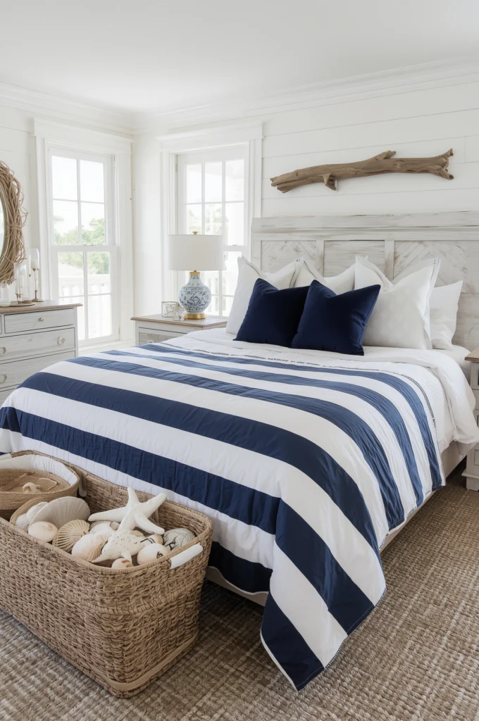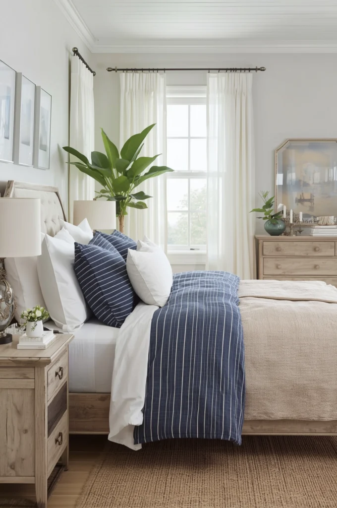 Navy and white together create a timeless coastal look that feels fresh and breezy. Think navy-striped bedding, whitewashed wood furniture, and rattan accents. A jute rug under the bed adds natural texture and warmth. This color scheme works perfectly for summer but can transition year-round with cozy layers. Nautical artwork, seashells, or rope-inspired decor pieces tie the theme together. Keep the walls light—white or pale gray—to maintain an airy atmosphere. If you want to lean into the beachy vibe, consider adding driftwood or woven baskets. This design is ideal for those who love a crisp, clean, and vacation-like bedroom feel.