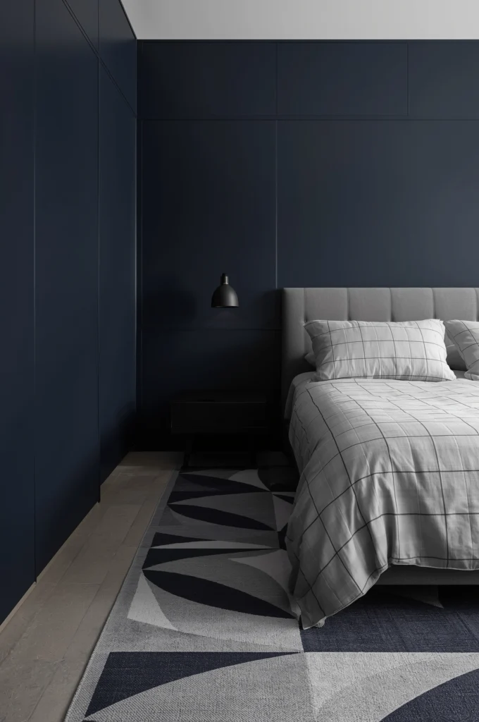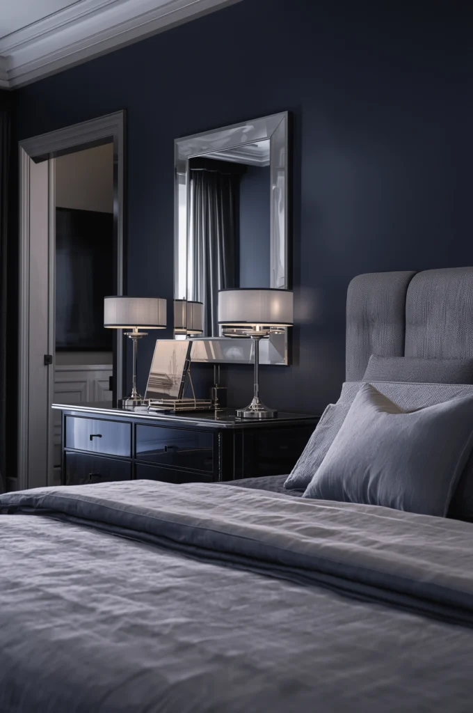 For a sleek and masculine vibe, pair dark blue with shades of gray. A navy accent wall combined with gray bedding creates a cool and contemporary look. This palette works well with geometric patterns or modern furniture. Add chrome or steel accents to enhance the modern feel. Keep the decor minimal to highlight clean lines and structure. If you want to soften the look, add textured throw blankets in light gray or a patterned rug. Navy and gray are both calming colors, making them ideal for creating a restful sleeping environment. This idea suits small city apartments as well as larger master bedrooms.