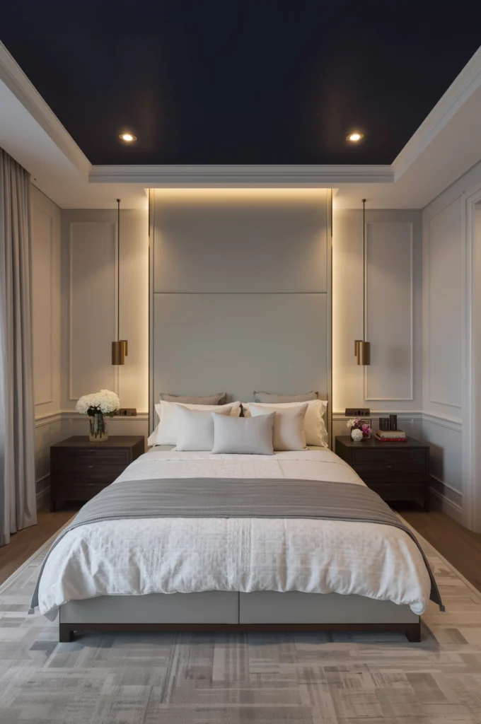 Painting your ceiling in dark blue is a bold and unexpected move that adds instant drama. Known as the “fifth wall,” the ceiling can completely transform a space when painted. Dark blue ceilings pair best with light-colored walls to balance the room. This works especially well in bedrooms with high ceilings, making them feel cozier and more intimate. Consider adding crown molding for a polished look. A navy ceiling with recessed lighting or a statement chandelier creates an elegant effect. For small spaces, use a semi-gloss finish to reflect light and prevent the ceiling from feeling heavy.