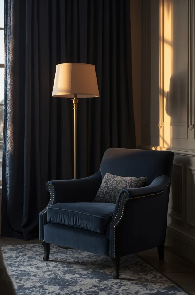 A navy accent chair adds both style and function to a bedroom. Place it in a reading corner or near a window for a cozy nook. Upholstered chairs in velvet or linen bring texture and color into the space. Pair the chair with a small side table and a reading lamp to make it practical. If your bedroom has a neutral palette, a navy chair becomes the perfect pop of color. Add a throw blanket or patterned pillow for extra comfort. Accent chairs are also great for layering different shades of blue without repainting walls or buying new bedding.