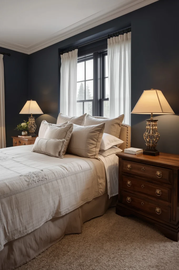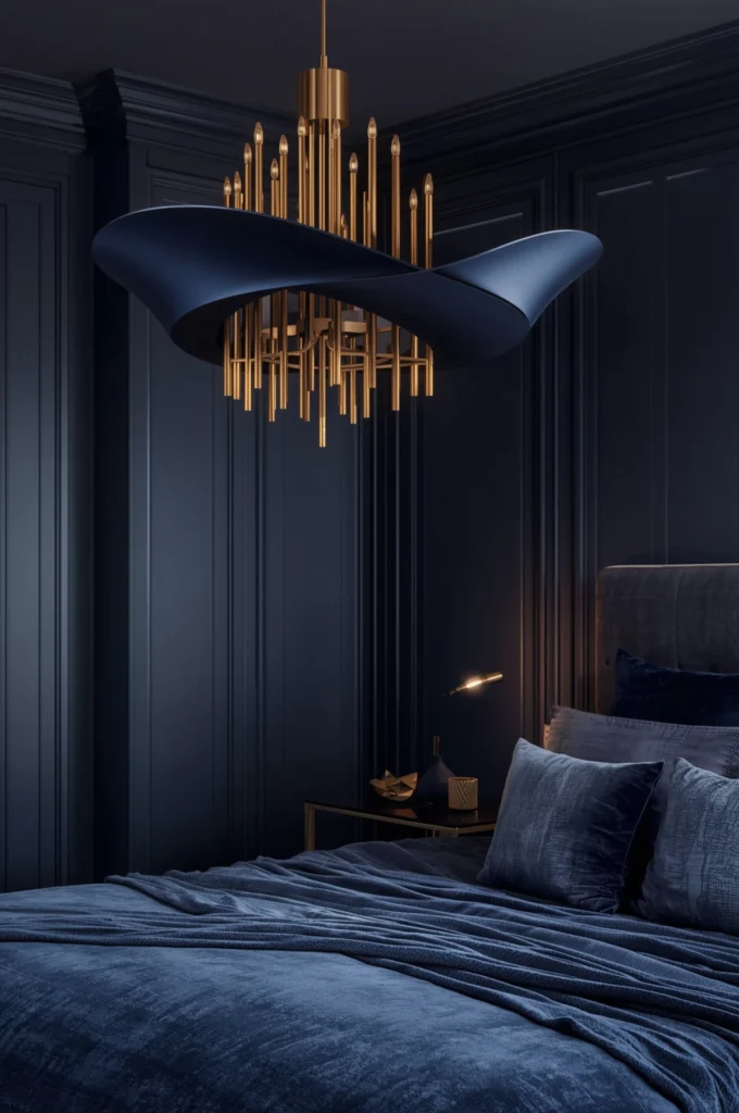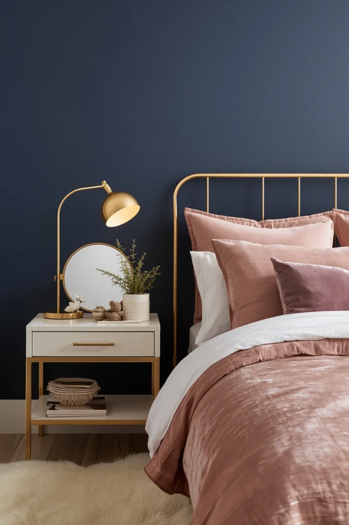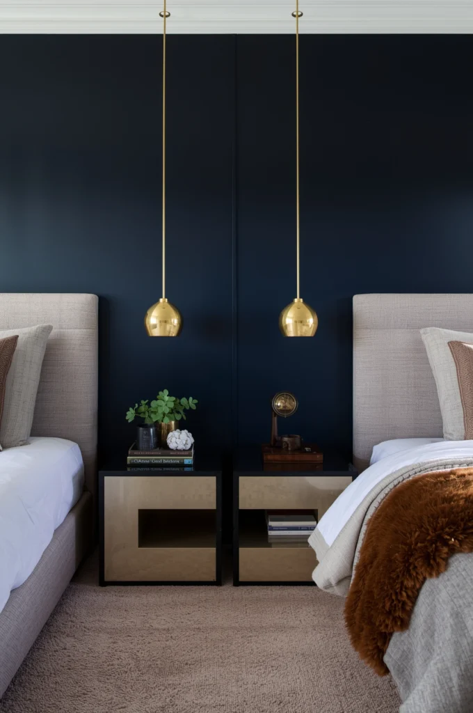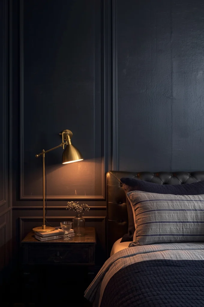 Lighting plays a huge role in bedroom design, and navy with brass accents makes a stunning combination. Look for navy lamps with brass bases or pendant lights with gold detailing. This pairing feels elegant yet modern, elevating even the simplest bedroom. Wall sconces with navy shades and brass arms are perfect for bedside reading. If you’re on a budget, spray-paint existing lamp bases navy and update the hardware with metallic finishes. The contrast of cool navy with warm brass adds balance and sophistication.
