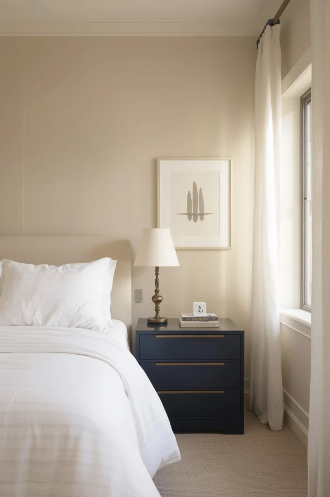 Painting your dresser or nightstands navy is a budget-friendly DIY that instantly upgrades your furniture. Dark blue furniture pieces act as statement accents in a bedroom with lighter walls. Use gold or brass hardware to add sophistication, or go with sleek black handles for a modern touch. Chalk paint or matte finishes work best for a trendy look. If you’re not ready to paint, try peel-and-stick wallpaper in a navy design for drawer fronts. Pair with matching navy decor items like vases or lamps to create a coordinated space.