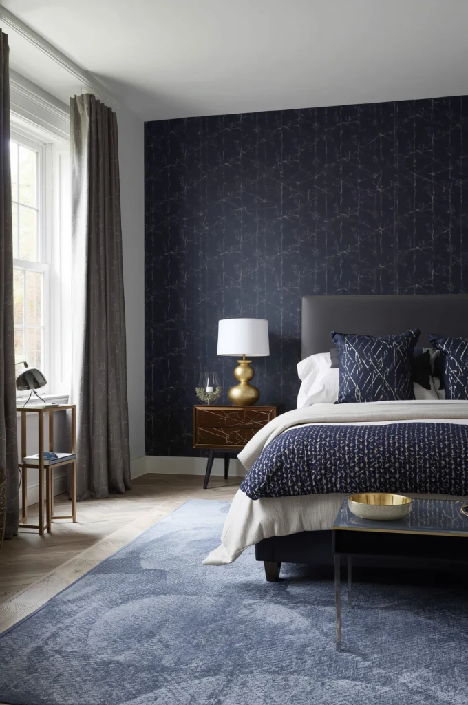 Wallpaper is an excellent way to bring navy into your bedroom without painting. Choose a bold navy floral, geometric, or textured design for an accent wall. Removable peel-and-stick wallpaper is renter-friendly and easy to change. If you want a subtle look, go for wallpaper with a soft navy pattern instead of solid coverage. Metallic accents in the wallpaper can reflect light and keep the space from feeling too dark. Wallpaper also adds character and can define your room’s style, whether modern, boho, or traditional.