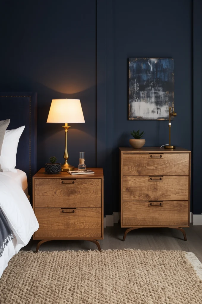 Navy and natural wood create a warm, balanced look. Wooden bed frames, nightstands, or dressers paired with navy walls or bedding feel cozy and timeless. The warmth of wood offsets the coolness of navy, preventing the room from feeling cold. Opt for mid-tone or light woods like oak or maple for contrast, or dark woods like walnut for a rich, moody vibe. Add woven baskets or rattan accents to enhance the natural feel. This combination works in rustic, farmhouse, or modern settings.