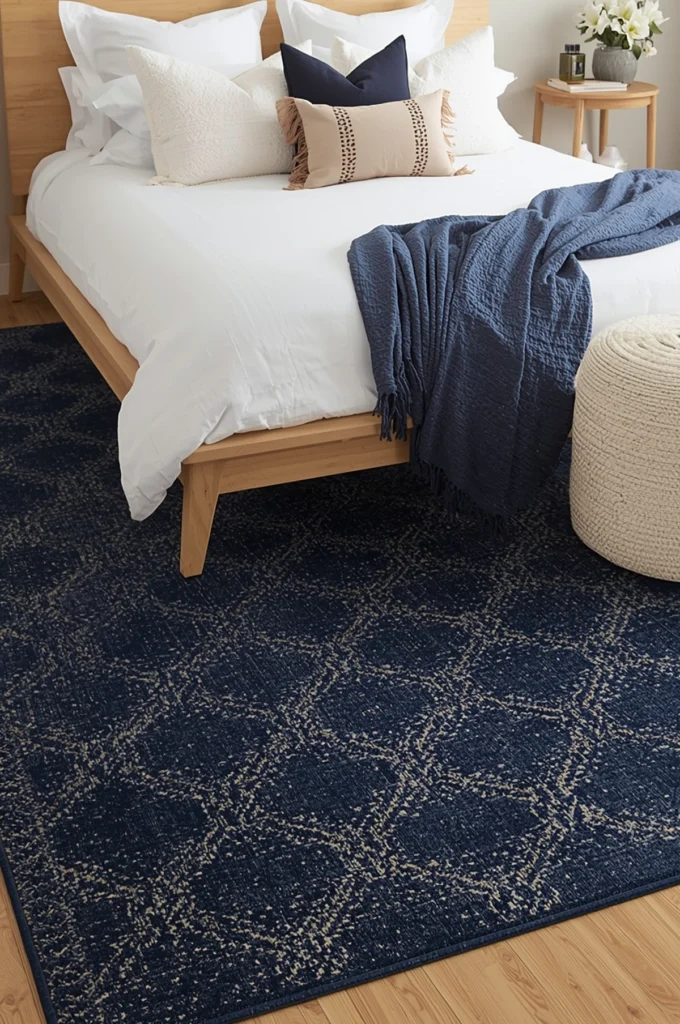 A navy area rug grounds the space and ties the entire room together. Whether you choose a solid navy rug or one with a patterned design, it adds coziness and warmth. Rugs are especially important if you have hardwood or tile floors. Look for rugs with subtle gold or gray accents to complement your overall theme. A large rug that extends beyond the bed creates a luxurious hotel-like feel. For a smaller room, opt for a lighter patterned rug with navy details so it doesn’t overwhelm the space. Area rugs also help absorb sound, making bedrooms feel more serene.
