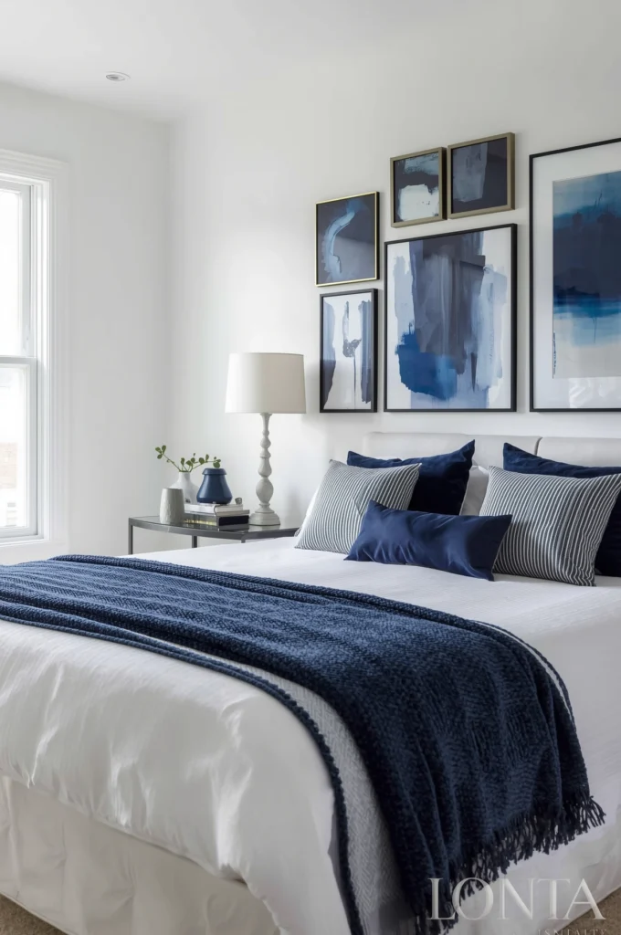 Wall art featuring navy and metallics like gold, copper, or silver adds instant glamour. Abstract navy paintings with gold accents make striking focal points. Metallic foil prints framed in navy bring a sophisticated touch. Choose art that complements your existing decor style, whether modern, glam, or minimalist. For a DIY option, create abstract art with navy and metallic paints on canvas. Place above the bed or dresser for maximum impact. Art is a flexible way to incorporate color without permanent changes.