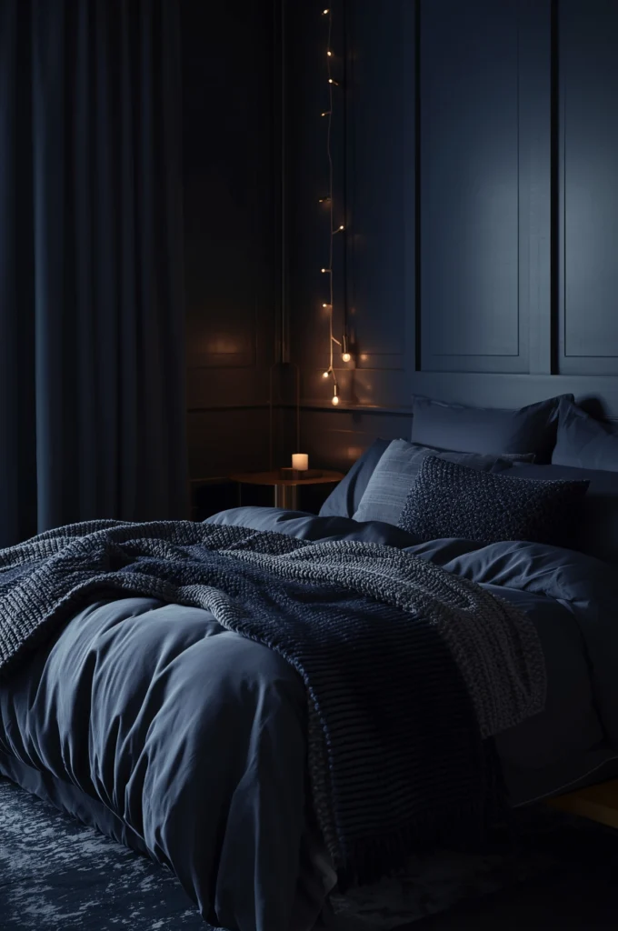 Switching to a dark blue bedding set is one of the simplest and most budget-friendly ways to incorporate the color into your bedroom. A navy duvet or comforter instantly changes the mood of the space. To avoid making the bed look too heavy, layer with lighter accent pillows or a white throw blanket. Navy bedding pairs beautifully with both modern and rustic furniture. Look for textured fabrics like quilted cotton, velvet, or linen to add depth. Dark blue sheets are also a practical choice because they hide minor stains better than lighter ones. This idea is great if you rent and can’t paint walls.