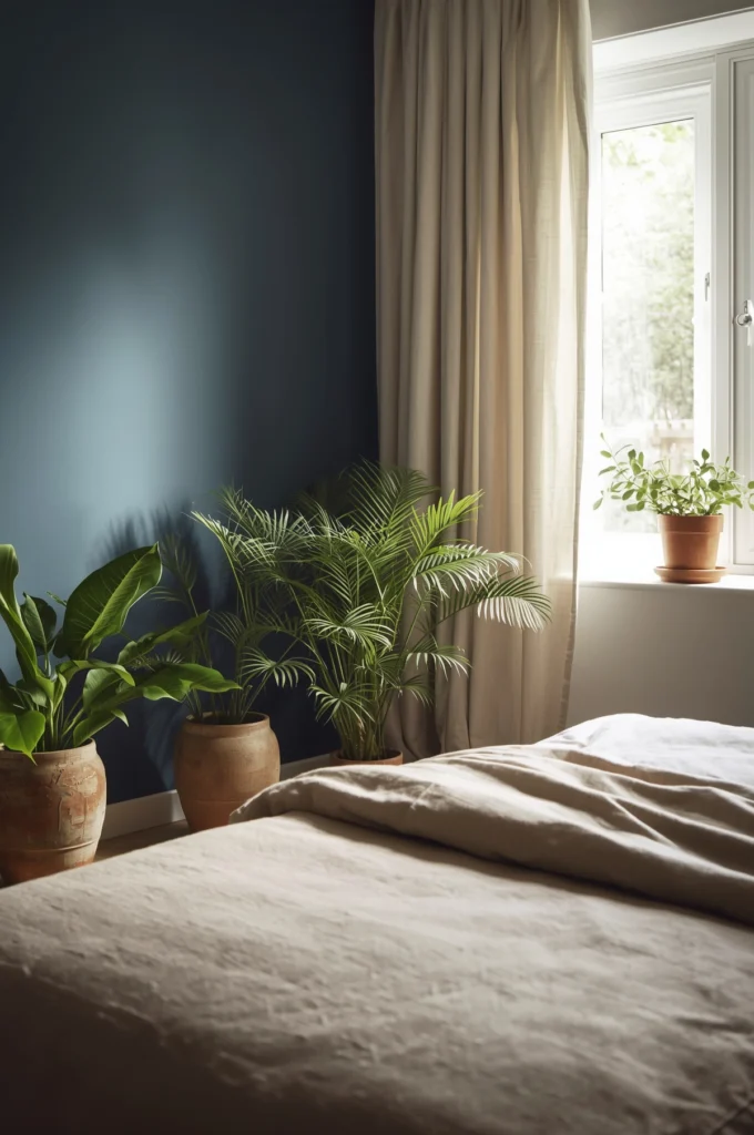 Green plants pop beautifully against navy walls or bedding, bringing freshness to the room. Plants like fiddle leaf figs, snake plants, or pothos thrive indoors and look stunning in navy planters. Hanging plants near a navy accent wall add dimension. If you don’t have natural light, opt for realistic faux greenery. Use woven baskets as plant holders to introduce texture. Plants also purify the air, making your bedroom healthier and more inviting. The combination of navy and green feels balanced and lively.
