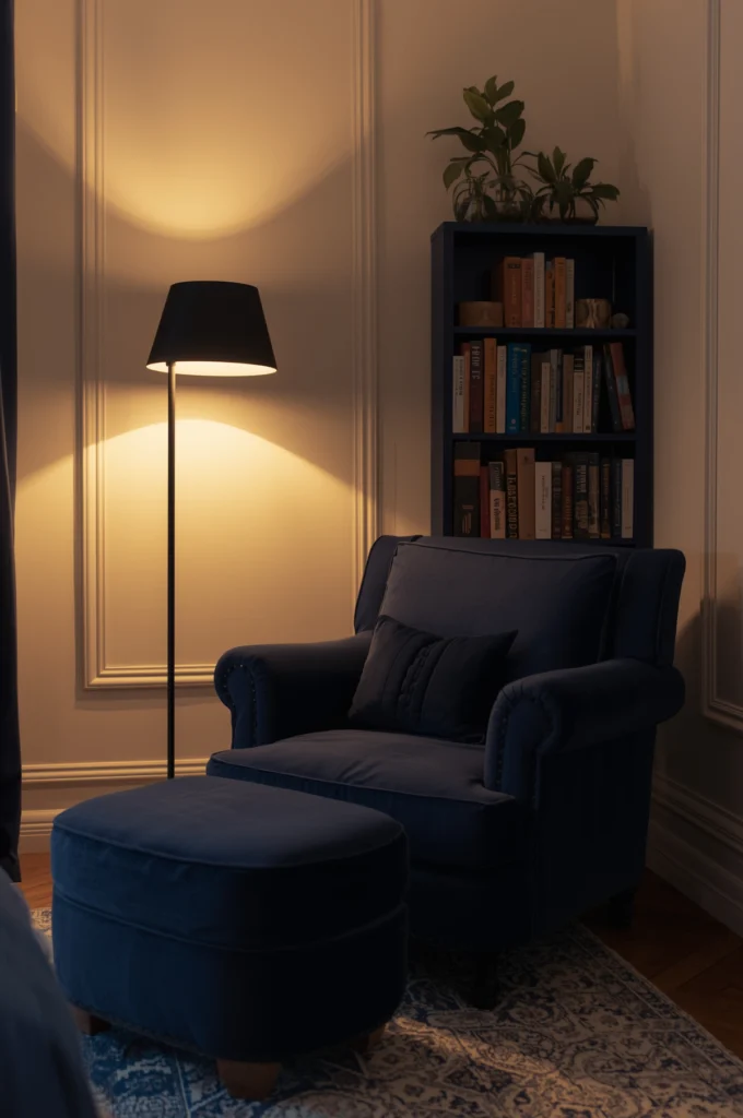 Updating your lampshades to navy is an underrated way to bring the color into your space. Lampshades are affordable and easy to switch. A navy shade with a brass or wood base adds elegance and warmth. Choose drum shades for a modern look or pleated designs for traditional style. If you want to DIY, wrap existing shades with navy fabric or paint them with fabric paint. Matching lampshades on bedside tables create symmetry and balance in the room.