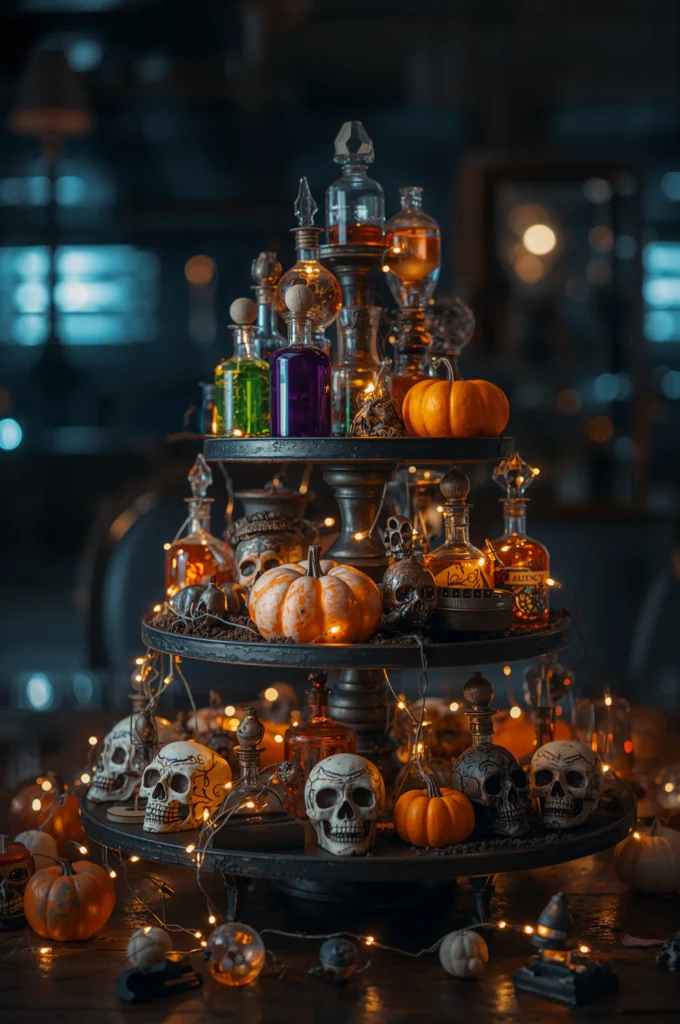 Tiered trays are trendy and versatile, making them the perfect base for Halloween décor. Use a Dollar Tree tray or DIY one with plates and candlesticks. Fill each tier with mini pumpkins, potion bottles, skulls, and fairy lights. Add seasonal trinkets like spiders, bats, or small signs for extra flair. This centerpiece is both functional and stylish, tying your Halloween theme together in one spot. It’s perfect for kitchens, living rooms, or dining tables.