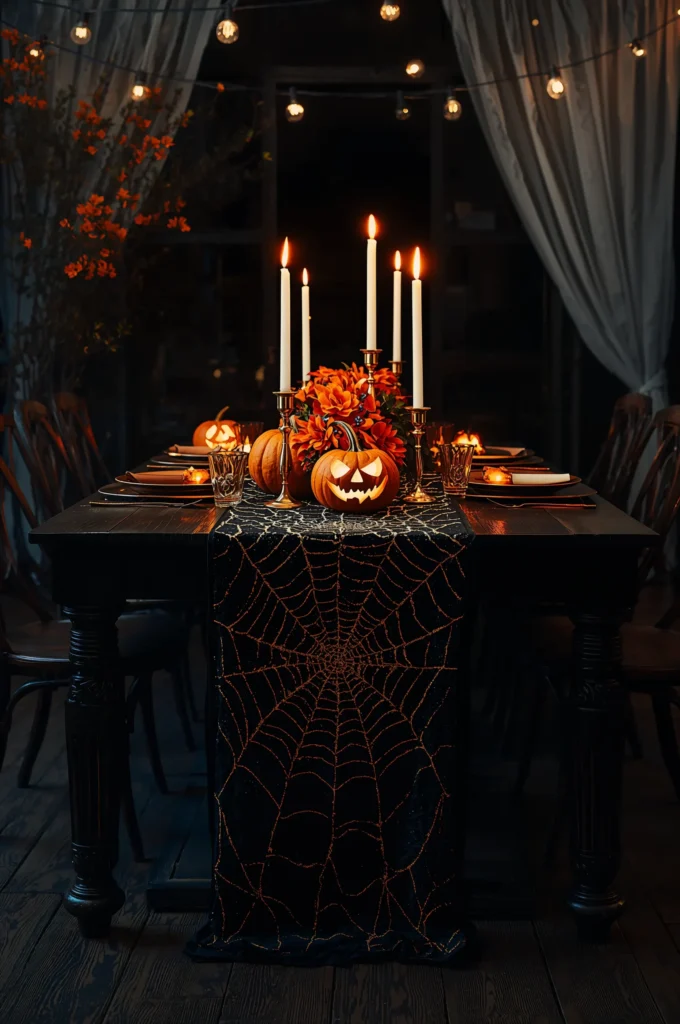 Skip the expensive table décor and make your own spider web runner with Dollar Tree mesh fabric. Cut the fabric into jagged, web-like patterns and stretch it across your dining table or coffee table. You can add plastic spiders, pumpkins, or candles on top to enhance the look. This craft is not only affordable but also gives your table an authentic haunted-house vibe. It’s the perfect backdrop for a Halloween party or family dinner. You can even use it under trays or centerpieces for layered, spooky styling.