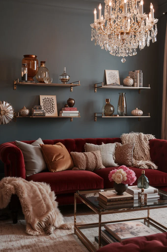 Floating shelves provide stylish storage and display options in a glam living room. Choose metallic or mirrored finishes for a luxe effect. Display decorative vases, sculptures, books, and candles. Arrange items in a curated way to avoid clutter. Use different shelf heights and depths for visual interest. Pair with jewel-toned furniture, plush rugs, and metallic accents. Shelves can highlight artwork, lighting, or plants. They are practical, stylish, and enhance the glam vibe. Floating shelves maximize wall space while maintaining elegance in your glam living room.