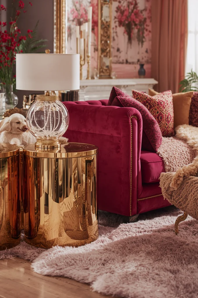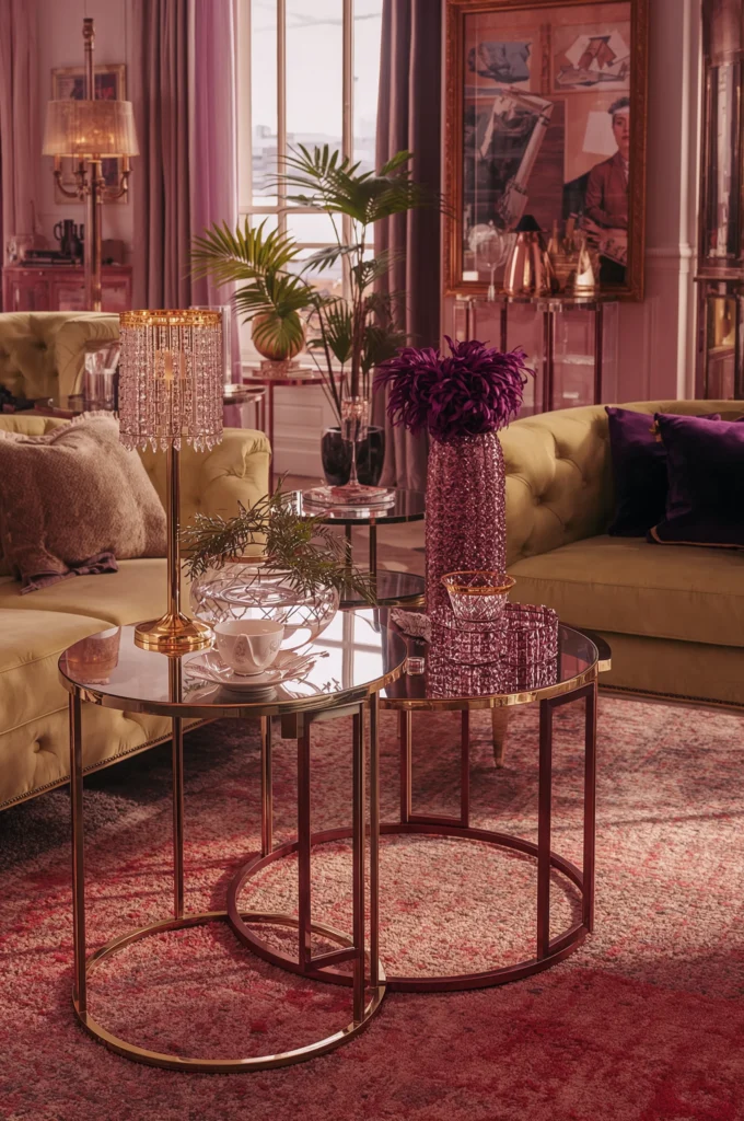 Metallic side tables bring both function and glam style to your living room. Use gold, silver, or brass finishes to complement jewel-toned furniture. Round, geometric, or mirrored tops add variety and interest. Place them next to sofas or armchairs for convenience. Layer with decorative items like lamps, candles, or sculptures. Metallic finishes reflect light and create a luxurious atmosphere. They are versatile, blending with modern, classic, or eclectic styles. Mix metals carefully to maintain cohesion. Metallic side tables anchor seating areas and enhance the glam aesthetic of the living room.