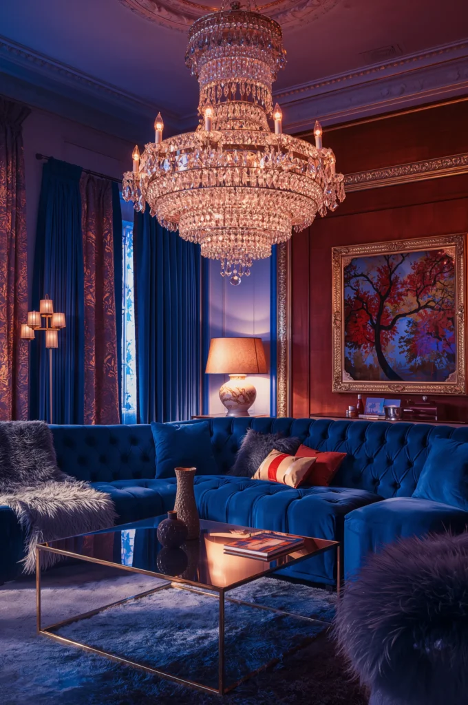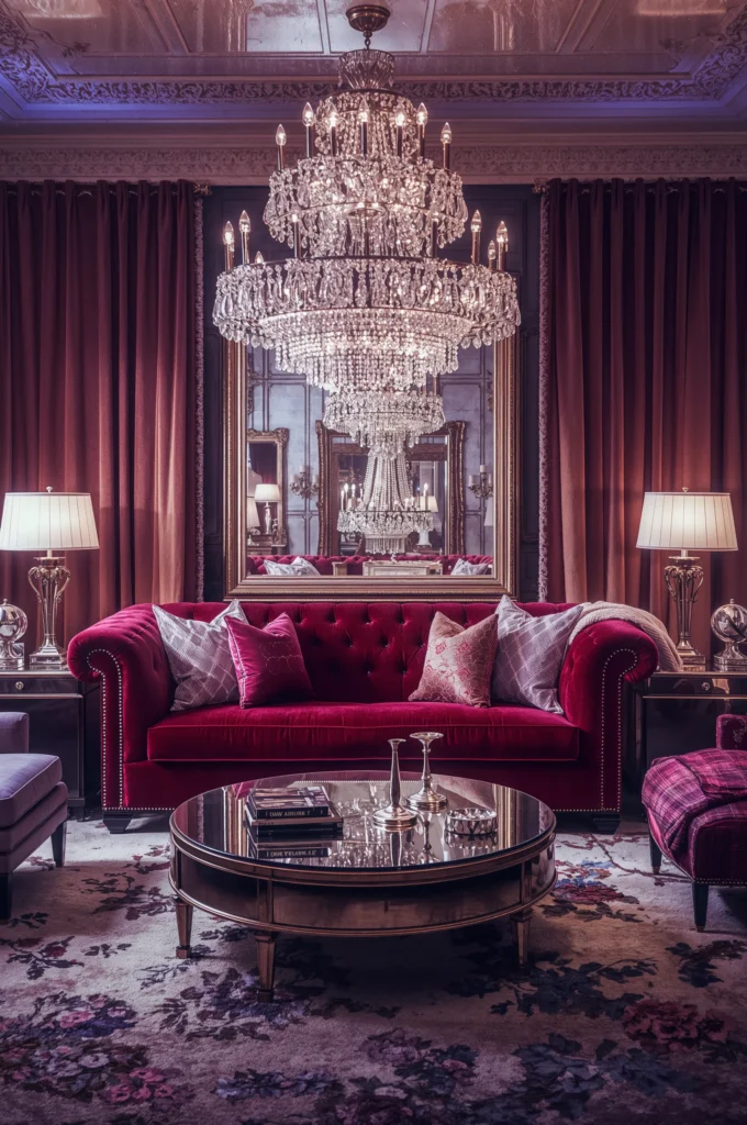 Crystal chandeliers are dramatic, luxurious, and perfect for a glam living room. They create sparkling light patterns and a stunning visual centerpiece. Choose multi-tiered or geometric designs for sophistication. Pair with metallic accents and mirrored furniture for enhanced glamour. Chandeliers add vertical interest and elegance. Layer with floor and table lamps for functional lighting. Ensure proper placement above seating or coffee tables for maximum impact. Crystal fixtures elevate the room’s luxurious vibe. They serve as both functional lighting and decorative art.