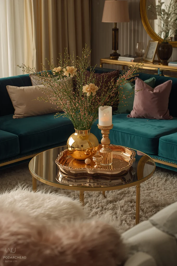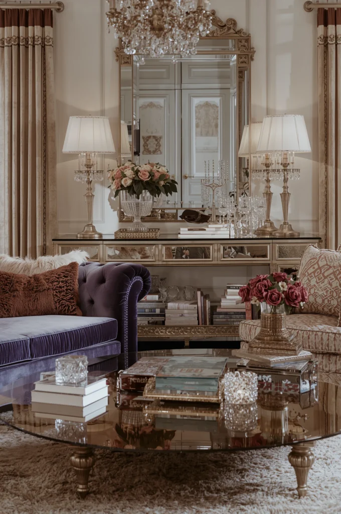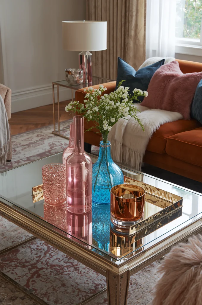 Glass accessories on a coffee table add sparkle without visual heaviness. Consider glass vases, bowls, or decorative boxes. Pair with metallic trays or mirrored bases to amplify the glam effect. Choose colored glass in jewel tones or clear glass for versatility. Layer with candles, sculptures, or books for a curated vignette. Glass surfaces reflect light, enhancing brightness in the room. They are easy to style and rearrange seasonally. Combine textures like glass, velvet, and metal for a luxurious feel. Glass accessories are elegant, practical, and perfect for a glam living room centerpiece.
