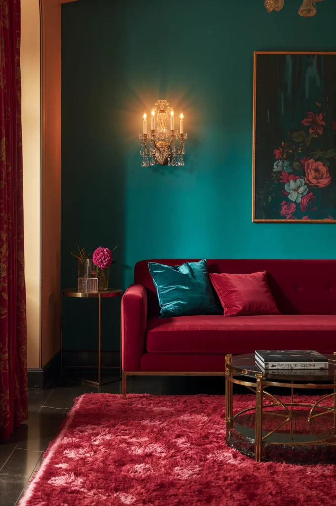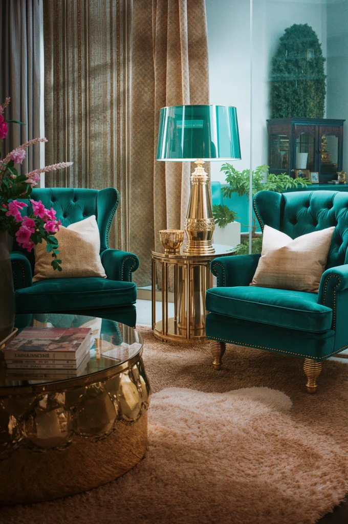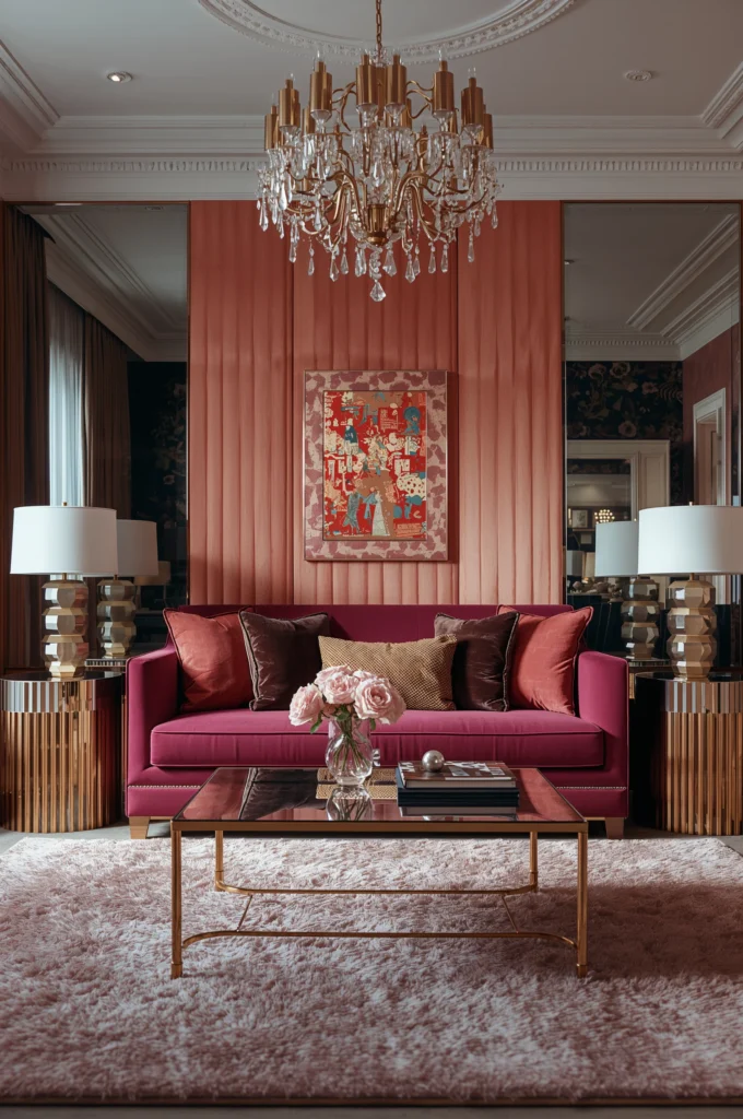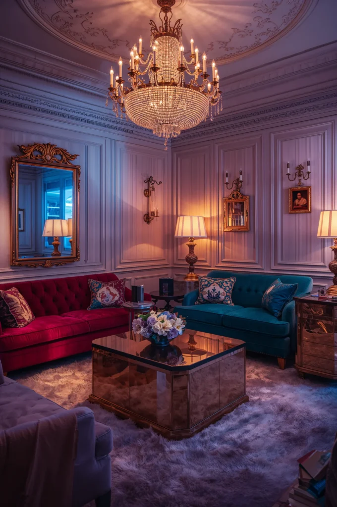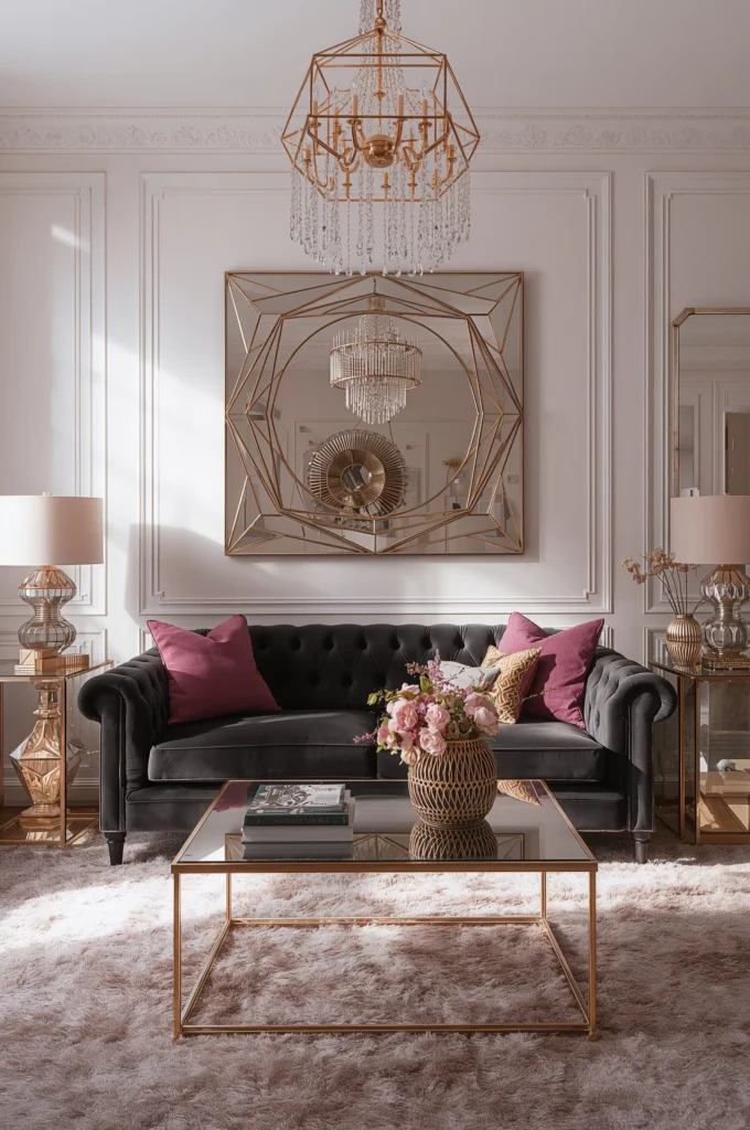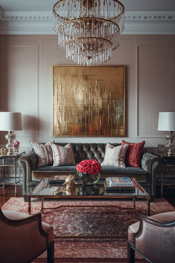 Art Deco elements bring timeless glam to your living room. Incorporate geometric shapes, metallic finishes, and bold patterns for a chic aesthetic. Think gold trim mirrors, chevron rugs, and geometric side tables. Jewel-toned furniture enhances the luxurious vibe. Layer textures like velvet and silk to soften sharp lines. Add crystal or glass accents for sparkle. Art Deco lighting fixtures, such as pendant lights or sconces, elevate the room’s elegance. Combine symmetry and asymmetry for a dynamic visual effect. The style brings a sense of luxury, drama, and structure to your glam living room.