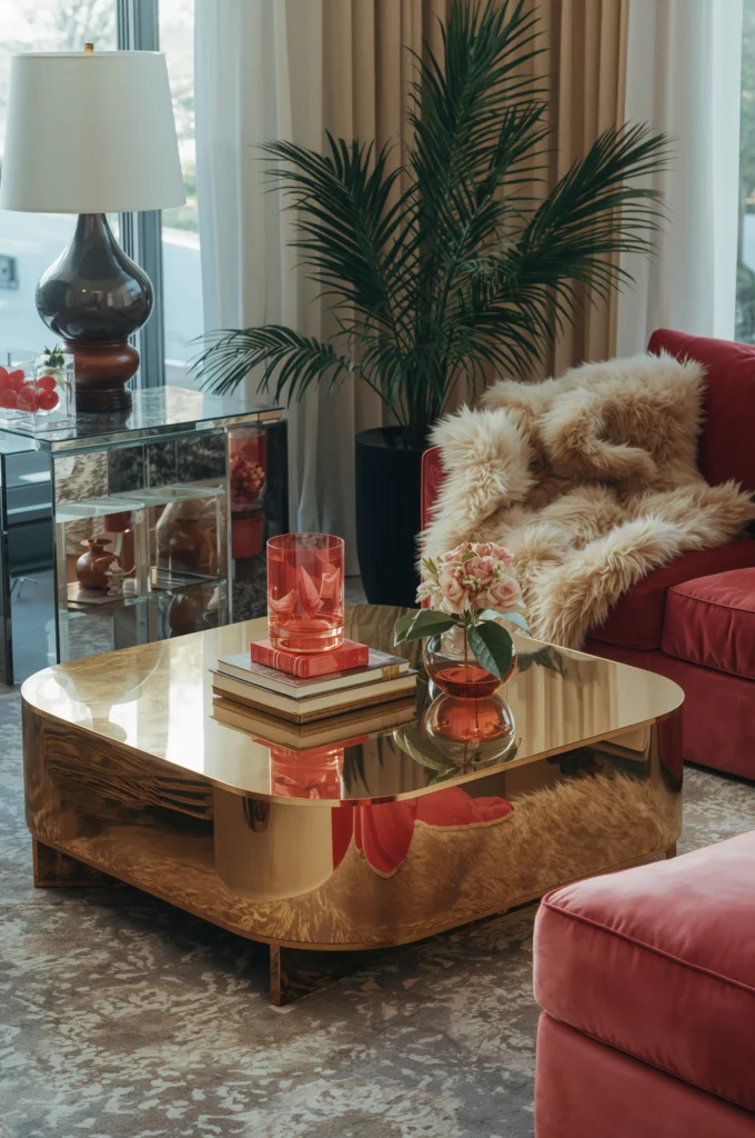 A metallic coffee table adds instant elegance to a glam living room. Choose gold, brass, or silver finishes to reflect light and create a luxurious feel. Pair it with jewel-toned sofas or plush seating to make it a focal point. Glass or mirrored tops add extra sparkle and make the room feel airy. Add decorative trays, candles, or sculptures for layered styling. Round or oval shapes soften sharp lines, while geometric designs add modern flair. A metallic coffee table is practical and stylish, perfect for entertaining or family gatherings. Combine with complementary side tables for a cohesive glam look. Its reflective surface enhances lighting, making the living room feel brighter and more inviting.