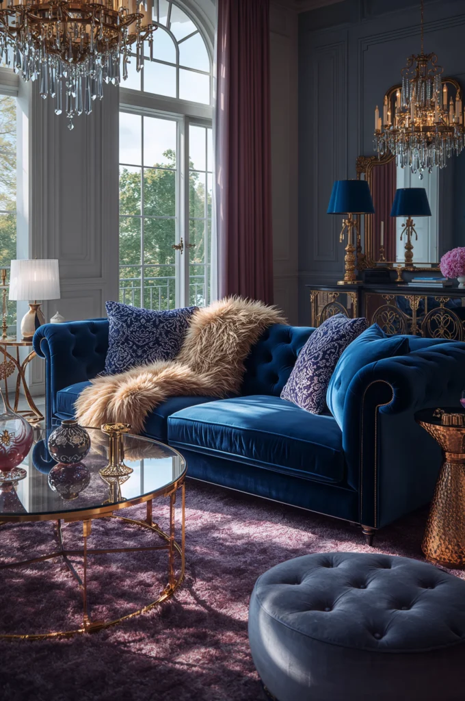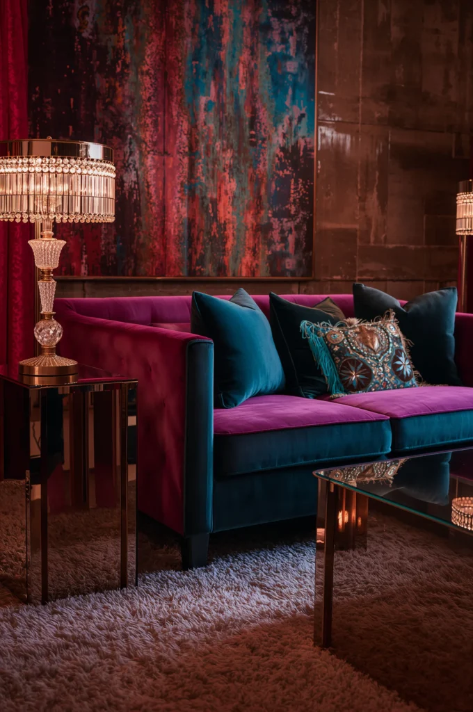 A jewel-toned velvet sofa instantly elevates any glam living room. Deep colors like emerald, sapphire, or ruby add richness and sophistication while remaining cozy and inviting. Pair the sofa with metallic accent tables and crystal accessories for a cohesive look. Layer plush throw pillows in complementary colors to enhance comfort and style. Velvet is not only luxurious but also soft and durable, making it perfect for everyday living. Consider a tufted design for extra elegance. To maintain the glam aesthetic, choose furniture legs in gold or brass finishes. Add a soft area rug underneath to anchor the seating area. Place a statement artwork above the sofa to draw attention. A jewel-toned sofa creates a bold focal point in your glam living room, making it both stylish and functional.