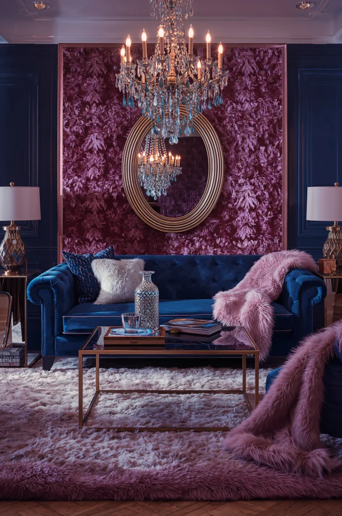 Faux fur throws and pillows add softness, texture, and luxury to a glam living room. Use them on sofas, armchairs, or ottomans to create cozy seating zones. Mix neutral and jewel-toned pieces for depth. Faux fur complements metallic accents and velvet furniture perfectly. Layer multiple throws or pillows to enhance the tactile experience. Choose high-quality faux fur for durability and visual appeal. They can be swapped seasonally for easy updates. Throws also protect furniture while adding comfort. Faux fur accessories make the glam living room feel inviting, stylish, and plush.