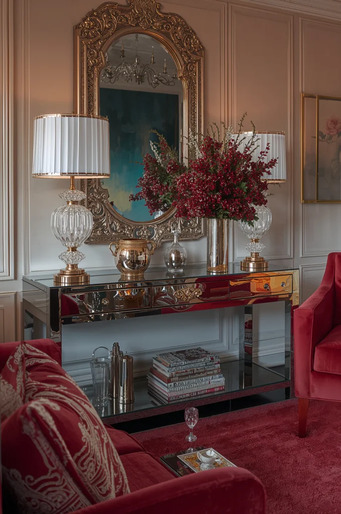 A statement console table enhances a glam living room by providing style and functionality. Choose mirrored, metallic, or bold-colored tables. Decorate with lamps, sculptures, books, or flowers. Pair with a statement mirror or artwork above for a curated look. The table can serve as a storage solution or display area. Metallic finishes reflect light, amplifying glamour. Layer textures and colors for visual interest. Place in entryways, behind sofas, or along empty walls. A statement console table ties together the glam aesthetic while being practical.