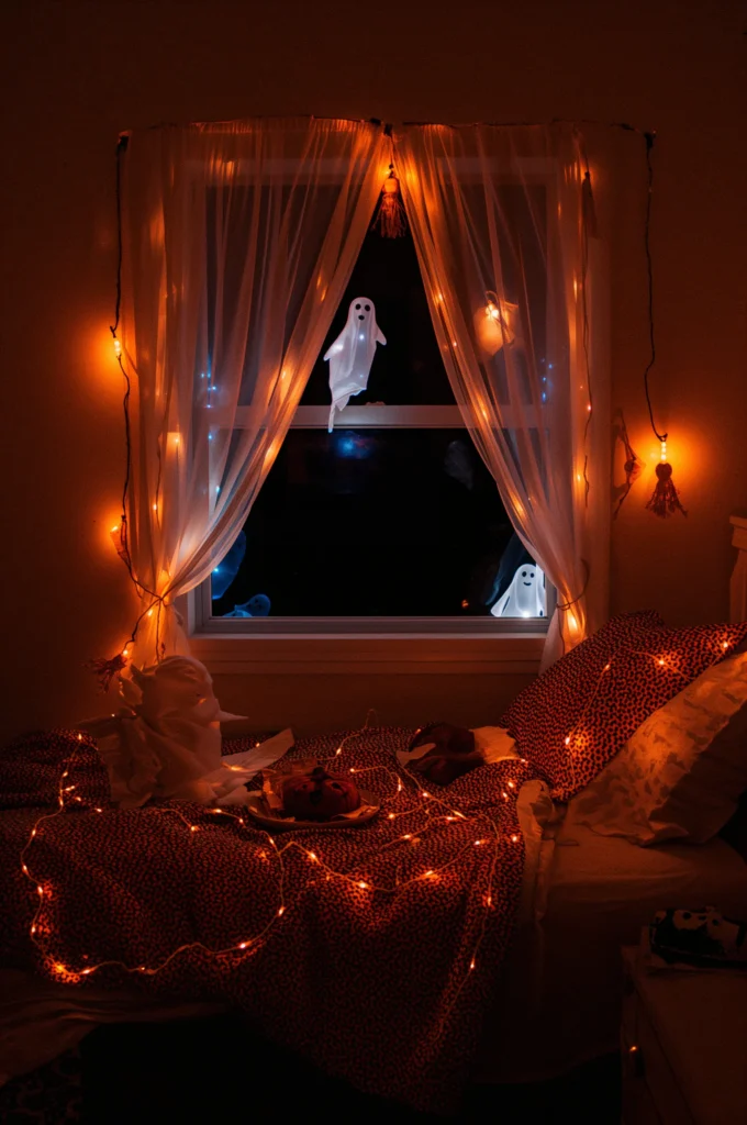 Spooky string lights are a simple way to elevate Halloween kids bedroom décor. From pumpkin and ghost shapes to warm white friendly lights, they create a cozy glow that feels festive but not too scary. Drape them across the bed, windows, or shelves for instant charm. Always choose battery-powered LEDs for safety, and pair them with mini pumpkins or wall decals. The glowing effect makes bedtime a fun Halloween adventure.