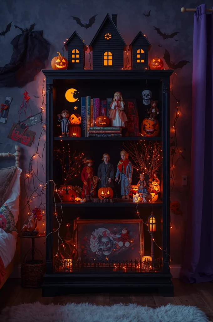 Turn an ordinary bookshelf into a creative focal point for your Halloween kids bedroom décor by transforming it into a mini haunted house display. Paint the back panels black or cover them with festive Halloween wrapping paper for an instant backdrop. Add little figurines like skeletons, ghosts, or pumpkins, and place battery-powered candles or fairy lights for a glowing effect at night. This fun project turns storage into seasonal decoration without taking up extra space. Kids can help decorate the shelves with their favorite Halloween toys or books, making it interactive. The best part? You can switch up the theme every year—spooky one year, whimsical the next—keeping the décor fresh and exciting.