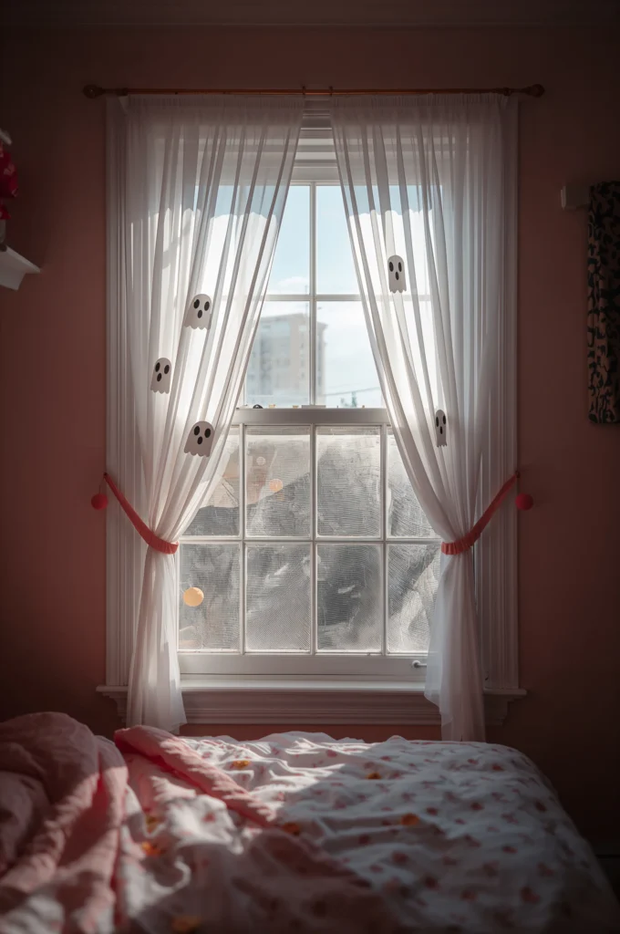 Curtains are often overlooked in Halloween kids bedroom décor, but they can completely change the vibe of the room. Start with simple white or sheer curtains and add ghost faces using black felt or fabric paint for a playful, non-scary effect. If DIY isn’t your thing, you can also find ready-made ghost-print curtains in stores during the Halloween season. Because curtains frame the window—a natural focal point—they’re the perfect spot to highlight festive décor. In the daytime, sunlight makes the ghost faces glow, while at night, pairing them with string lights or window decals enhances the charm. This renter-friendly upgrade is quick, affordable, and makes a big impact.