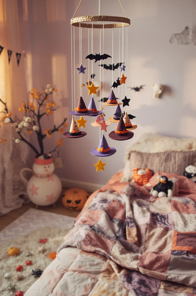 A Halloween mobile is an adorable addition above a child’s bed or reading corner. Create one using felt witch hats, bats, and stars hung from embroidery hoops or sticks. Spray paint the hats black or even pink for a whimsical twist. Hang it at a safe height where kids can admire it without pulling it down. Mobiles add movement and charm to a room, making them great for younger children. You can also buy pre-made versions online if DIY isn’t your thing. It’s a lightweight, affordable piece that adds big Halloween personality to the space.