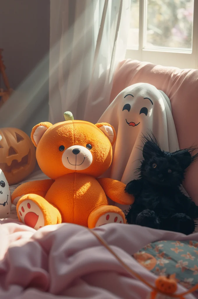 Stuffed animals are a favorite for kids, so why not make them Halloween-themed? Look for plush pumpkins, ghosts, bats, or black cats. You can also dress regular stuffed animals in Halloween costumes for a DIY version. Place them on the bed, shelves, or reading corner for instant festive charm. They’re soft, safe, and fun, making them ideal for younger children. Halloween plushies also make great keepsakes or gifts. Unlike some decorations, they’re cuddly and interactive, which kids love. This idea keeps the room fun without being scary, making it perfect for all ages.