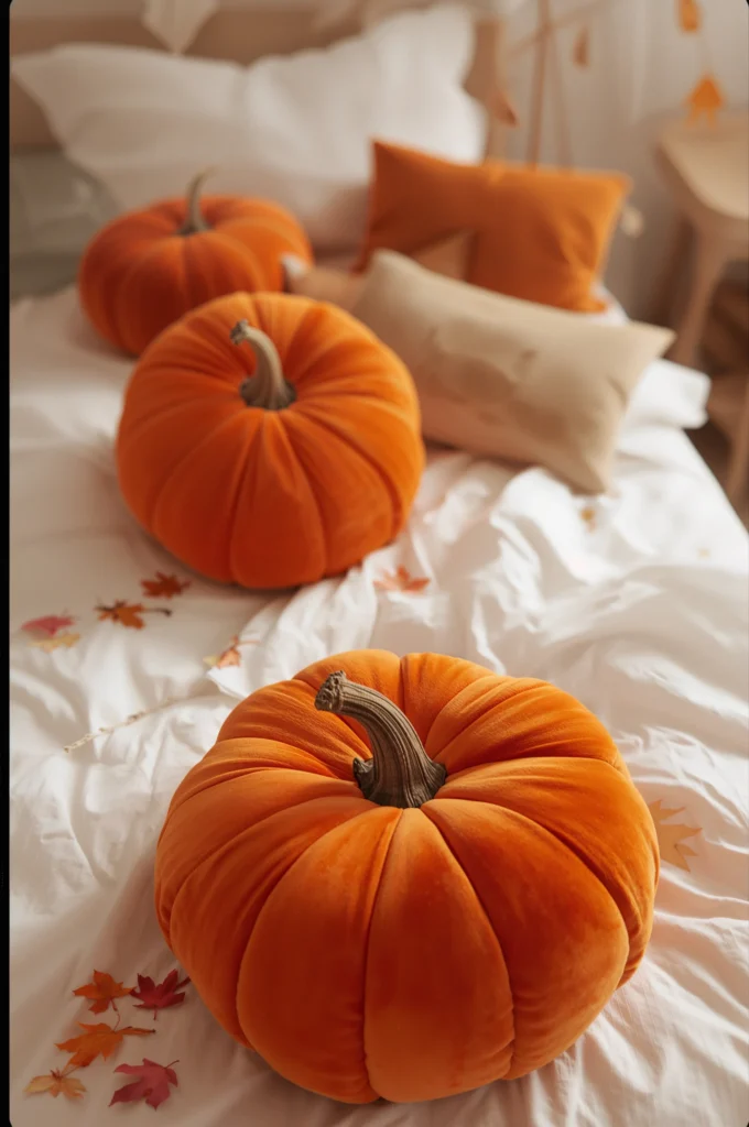 Pumpkin-shaped pillows are a fun DIY project that perfectly complements Halloween kids bedroom décor. You can buy round orange pillows and add felt stems and jack-o’-lantern faces for a festive look. If you enjoy sewing, make your own pumpkin cushions from orange fabric for a cozy handmade touch. Place them on the bed, reading nook, or floor for extra seating. To add variety, mix them with ghost or bat-shaped pillows. Not into sewing? Stores like Dollar Tree often carry seasonal plush pillows you can customize with paint or iron-on designs. These playful accents bring charm, coziness, and even work as adorable photo props for family Halloween pictures.