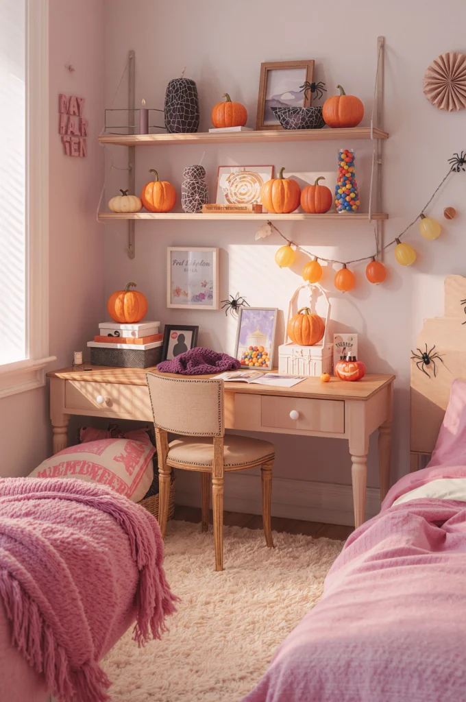 Nothing says Halloween like candy, and it makes a perfect bedroom theme. Add candy-shaped pillows, lollipop wall decals, or faux candy jars filled with colorful pom-poms. You can even hang candy garlands across shelves or doors. This look works especially well for younger kids who prefer fun over spooky. Bright pops of pink, purple, and orange create a cheerful vibe. You can DIY candy decorations with cardboard and paint, making it a fun family project. To keep things safe, avoid real candy in the bedroom—stick to faux pieces that won’t attract pests. A candy theme guarantees a playful, whimsical Halloween setup.