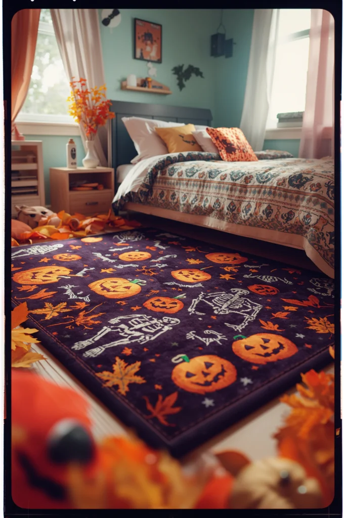Changing the rug is a quick way to upgrade your Halloween kids bedroom décor and set the mood for the season. Rugs with pumpkins, skeletons, or spider web designs instantly add character and playfulness. A small rug beside the bed or under a reading nook makes the space cozy and inviting. If you’d rather not invest in a large seasonal rug, even a fun Halloween doormat can double as a mini accent rug. Choose washable options to handle candy crumbs or spills with ease. Pairing the rug with themed pillows or bedding creates a cohesive look, making this both a practical and festive upgrade.