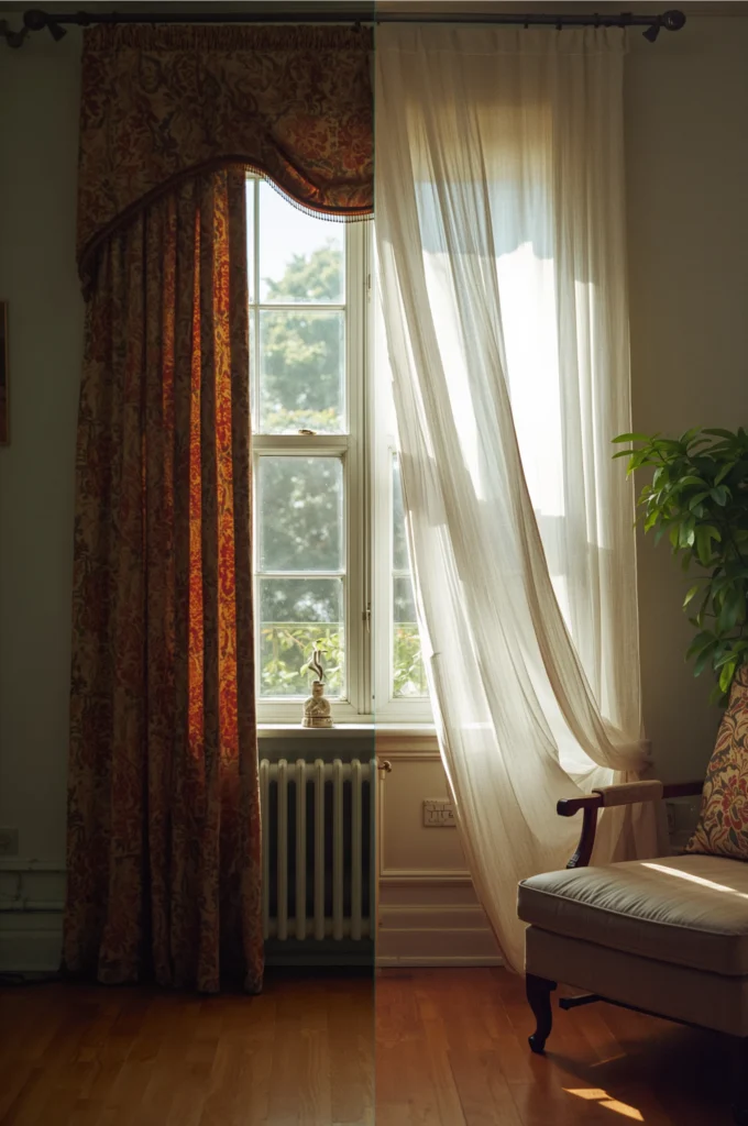 Thick, ornate drapes were once a status symbol, but today they’re one of the clearest outdated home trends. They block natural light, make rooms feel smaller, and often look fussy. Modern homeowners prefer lighter window treatments such as linen curtains, Roman shades, or simple roller blinds. These options allow more natural light while still providing privacy. To update your windows, start by removing heavy drapes and replacing them with neutral or light-colored fabrics. If you like drama, opt for floor-to-ceiling curtains in a breathable material. This creates height without weighing down the room. Natural light is one of the most desirable features in a home, so your window treatments should enhance, not block, it.