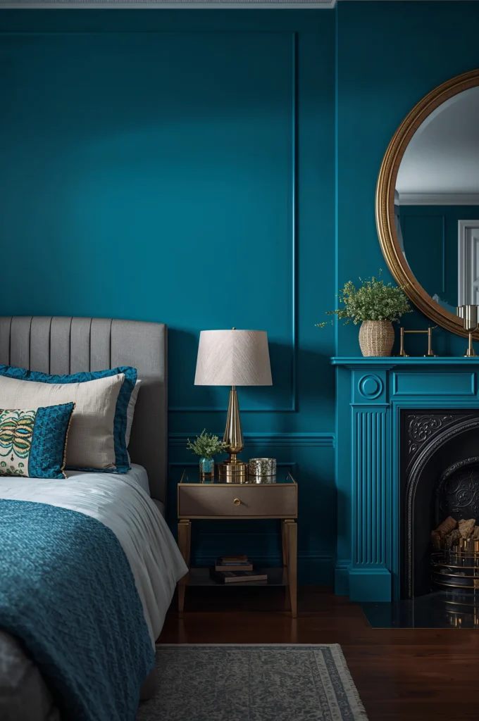 A peacock blue headboard creates a striking focal point in the bedroom. Upholstered in velvet, it adds glamour, while in linen or cotton it feels more casual and approachable. This jewel tone works especially well against neutral or light-colored walls, ensuring it stands out. Pair the headboard with complementary bedding in whites, creams, or metallics for balance. Tufted or wingback headboard styles add extra elegance, making your bedroom feel like a boutique hotel. For smaller rooms, opt for a simple flat panel in peacock blue to avoid overwhelming the space. Adding brass or gold bedside lamps enhances the richness of the shade. This is a great way to experiment with bold color without repainting walls. A well-styled peacock blue headboard makes your bedroom feel sophisticated and inviting.