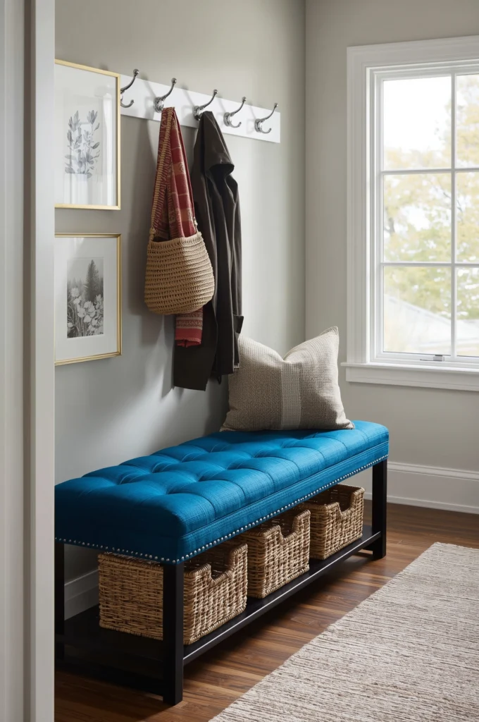 An entryway bench in peacock blue adds both style and functionality to your home’s first impression space. Upholstered in velvet, it feels luxe, while in leather or linen it leans modern and casual. Pair it with light or neutral walls to make the color stand out. Add throw pillows or a cozy blanket in complementary shades for layering. A bench in this color works beautifully with brass coat hooks, gold-framed mirrors, or wooden storage baskets. It’s also practical, providing seating for putting on shoes or extra storage with bins underneath. If your entryway is small, this single bold piece can make the space feel intentional and designed. It’s a quick DIY upgrade too—simply reupholster an old bench with peacock blue fabric. This addition balances functionality with a stylish pop of personality.